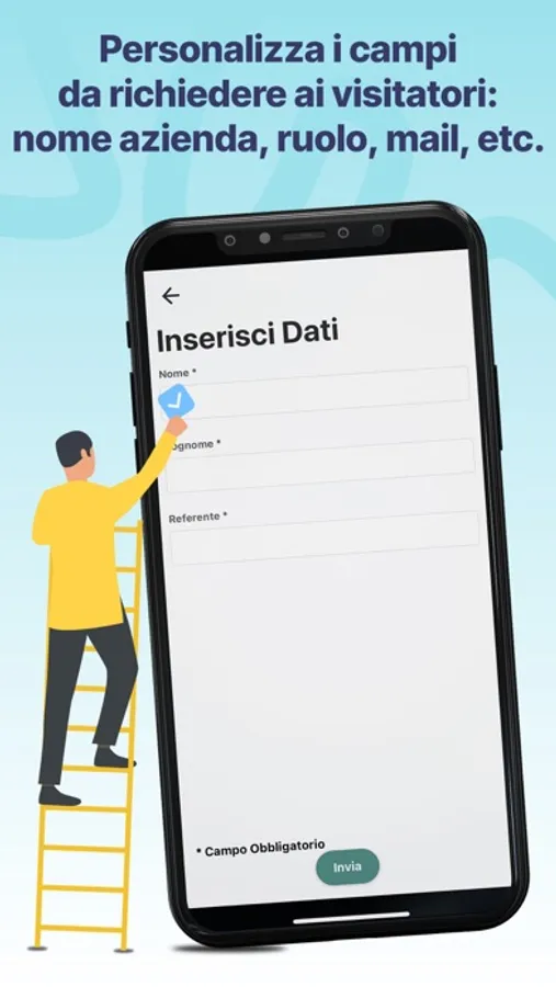 Personalizza i campi da richiedere ai tuoi visitatori: carta d'identità, nome azienda, ruolo, mail, telefono, etc.