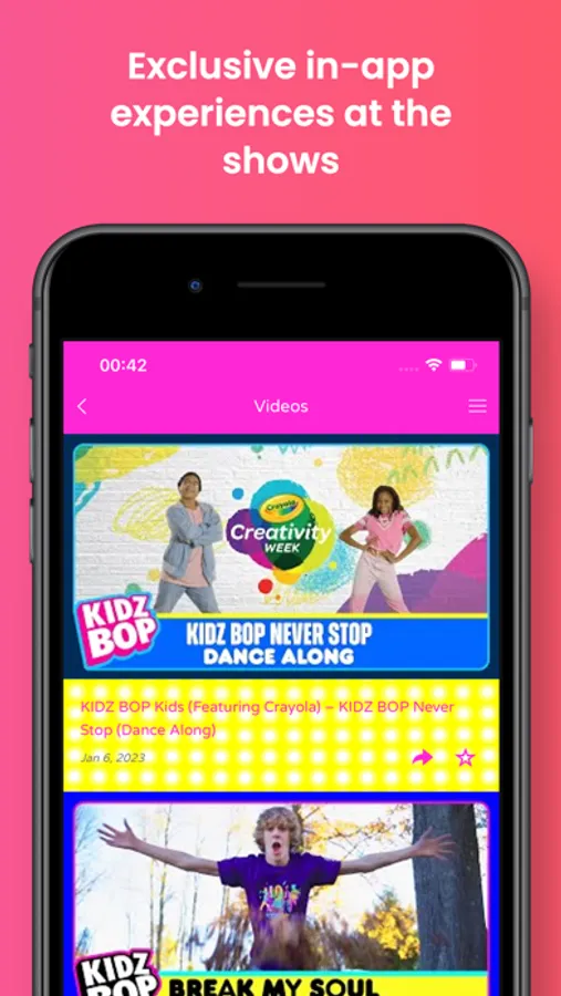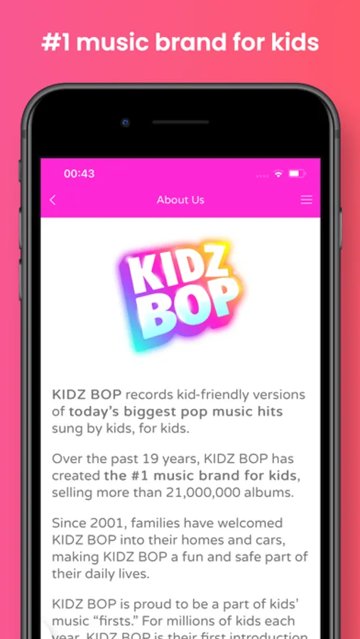 Parents, get ready for KIDZ BOP Live – the ultimate family concert experience – with the KIDZ BOP Live app! The KIDZ BOP Live app is your source for tour info, tickets, exclusives, fun photo filters, tour news and more. Get Ready For The Show: Get your tickets and check out KIDZ BOP videos to learn some moves Enjoy KIDZ BOP Live: Access exclusive in-app experiences at the shows, Stay informed with alerts + notifications Stay up to date on all things KIDZ BOP: After the show, get KIDZ BOP news including all future dates and fan exclusives right on the app About KIDZ BOP: KIDZ BOP connects with kids and families through its best-selling albums, music videos, consumer products and live tours. In the US, KIDZ BOP is the #1 music brand for kids, featuring today's biggest hits "sung by kids for kids." KIDZ BOP has sold over 21 million albums and generated over 4.5 Billion streams since the family-friendly music brand debuted in 2001. The best-selling series has had 24 Top 10 debuts on the Billboard 200 Chart; only three artists in history—The Beatles, The Rolling Stones, and Barbra Streisand—have had more Top 10 albums.