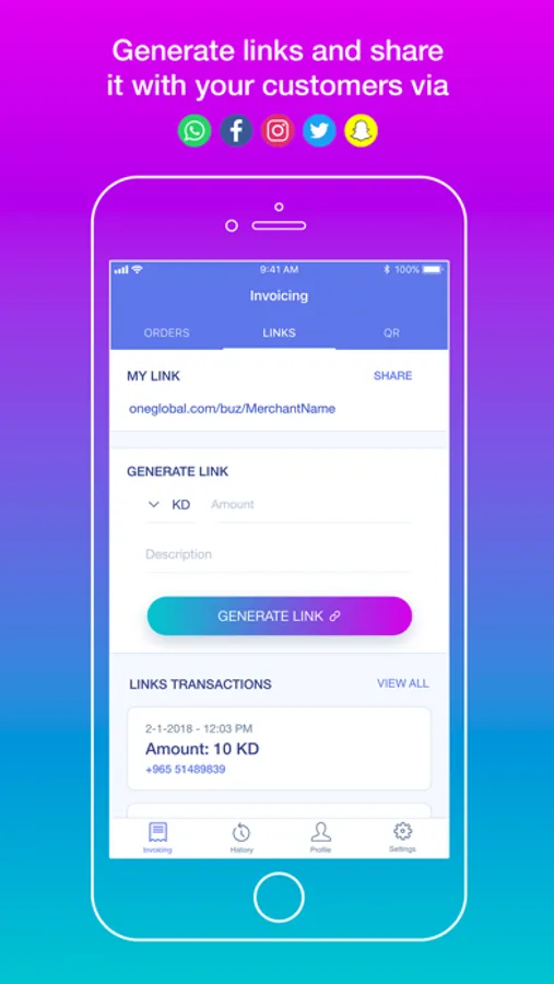 • By entering the amount, description (if any) and clicking on “Generate Link”.