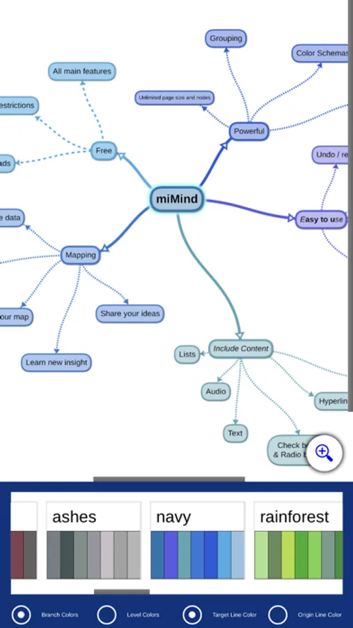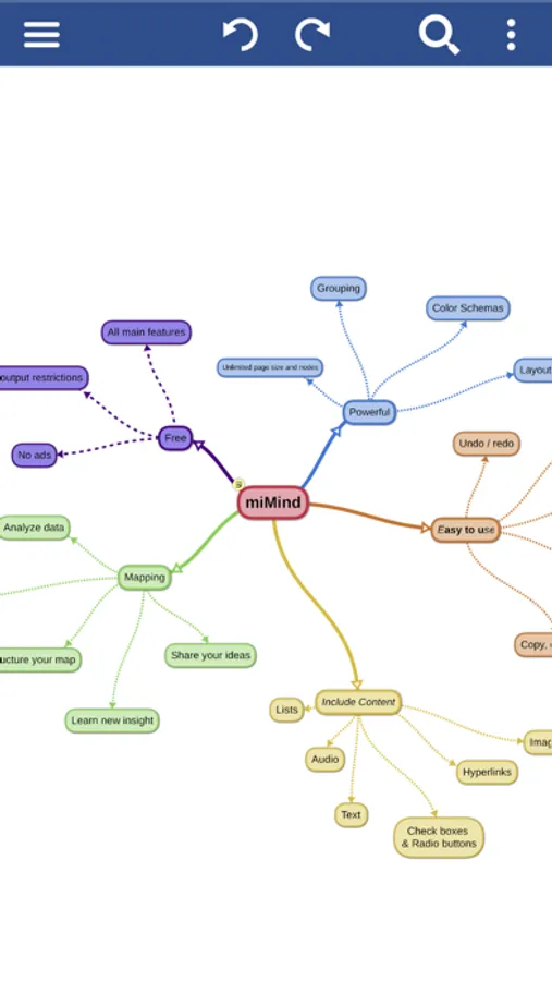 miMind is a powerful tool for organizing your thoughts, laying out schemes, and sharing them with your friends and co-workers. Develop anything from simple bucket lists to professional engineering concepts. The app includes dozens of layouts, color schemes, shapes, patterns, and much more. Once your map is complete you can also share or export it to an image, PDF, text or XML file.