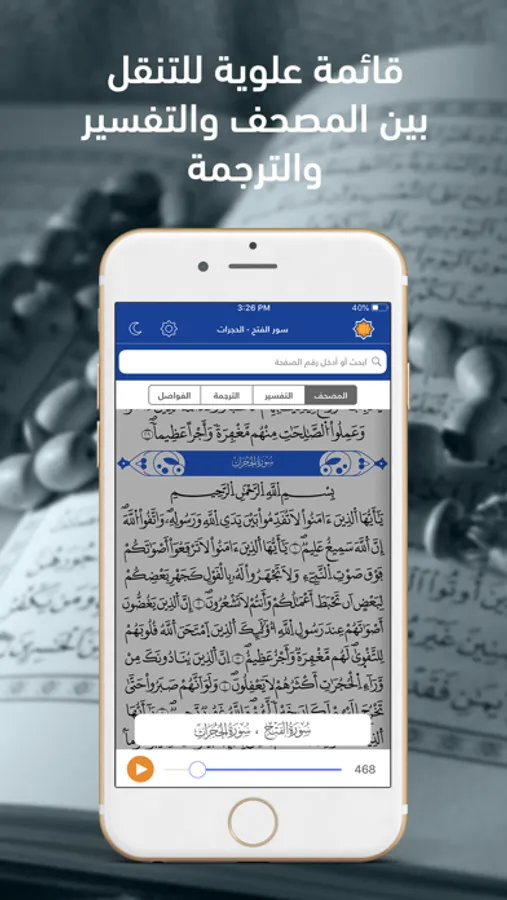 نسخة شاملة ومطورة من المكتبة الصوتية للقرآن الكريم (موقع وتطبيق MP3 Quran) مخصص للهواتف الذكية لقراءة القرآن الكريم والاستماع إلى تلاواته من مصحف ورش .