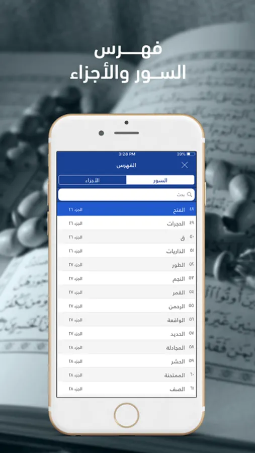 فهرس بأسماء السور والأجزاء، لسهولة وسرعة الوصول للجزء المطلوب .
