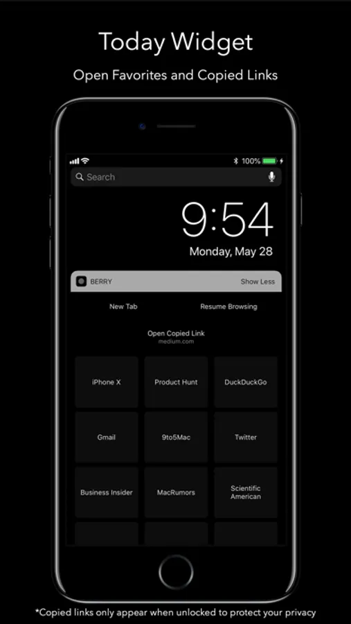 Copy links and tap the widget to browse them peacefully in Berry. Link previews are only visible when your device is unlocked, to protect your privacy. Also, instantly get to your favorites (in dark mode) from the lock screen, bypassing the home screen.