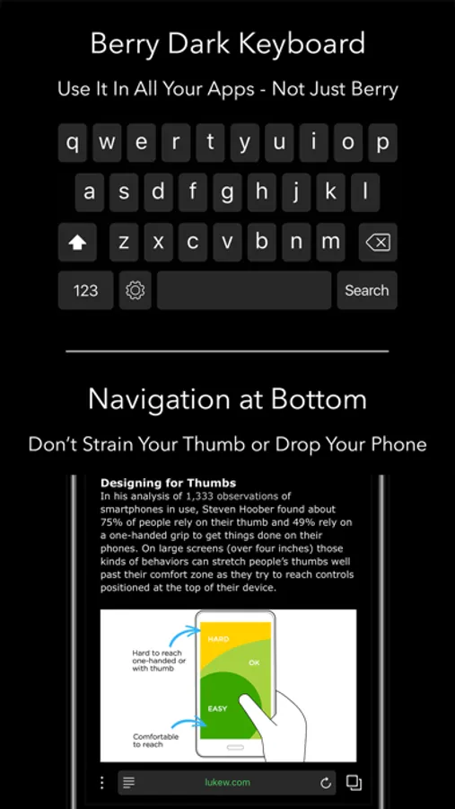 All of Berry's controls are at the bottom, not the top of the screen, so you don't strain your thumb trying to navigate the web - or worse, drop your phone trying to tap the search bar.