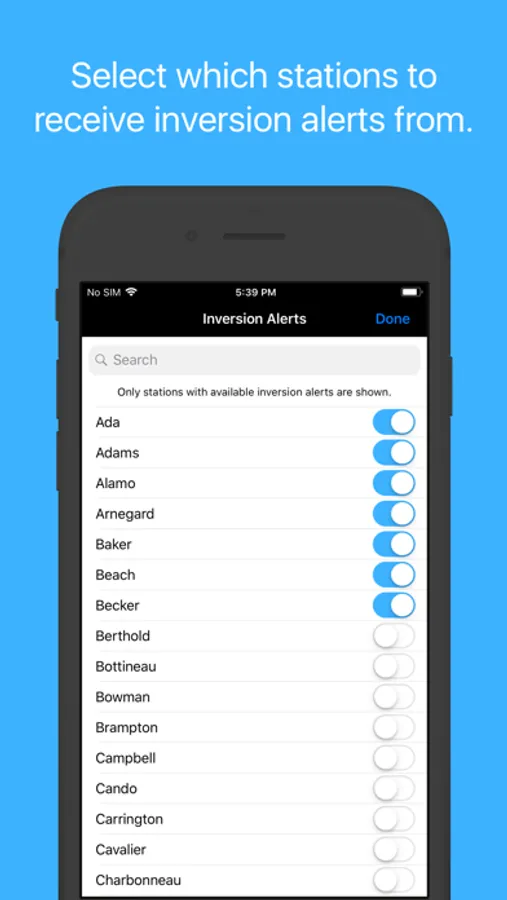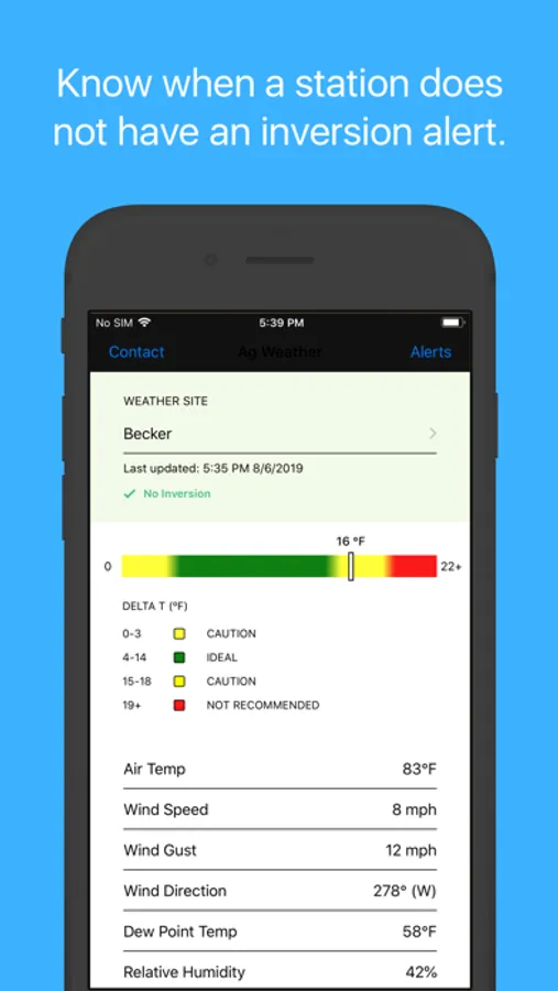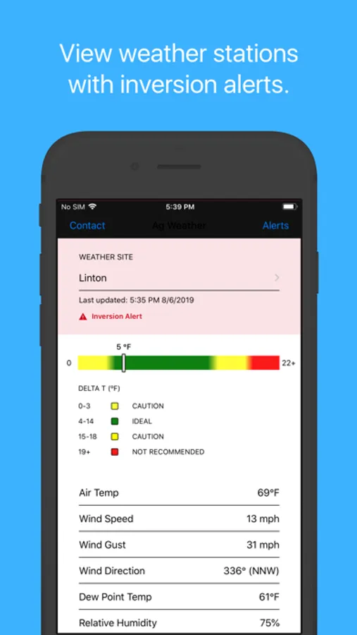 Real-time weather data from the North Dakota Agricultural Weather Network (NDAWN) is used to detect low-level air temperature inversions. An air temperature inversion occurs when the air temperatures near the ground are colder than the air above. The cooler and therefore, denser air, may make spray particles drift off target, often referenced as spray drift. Because spraying during an air temperature inversion is in violation of label instructions, this app, once an inversion is detected, sends a push notification to the user informing them that spraying may longer be advisable. These inversion alerts are resent occasionally until the inversion is no longer present for the station selected. Besides inversion alerts, weather data, including wind speed and temperature data which is also critical information while spraying is available. All NDAWN stations update current weather conditions every 5 minutes.