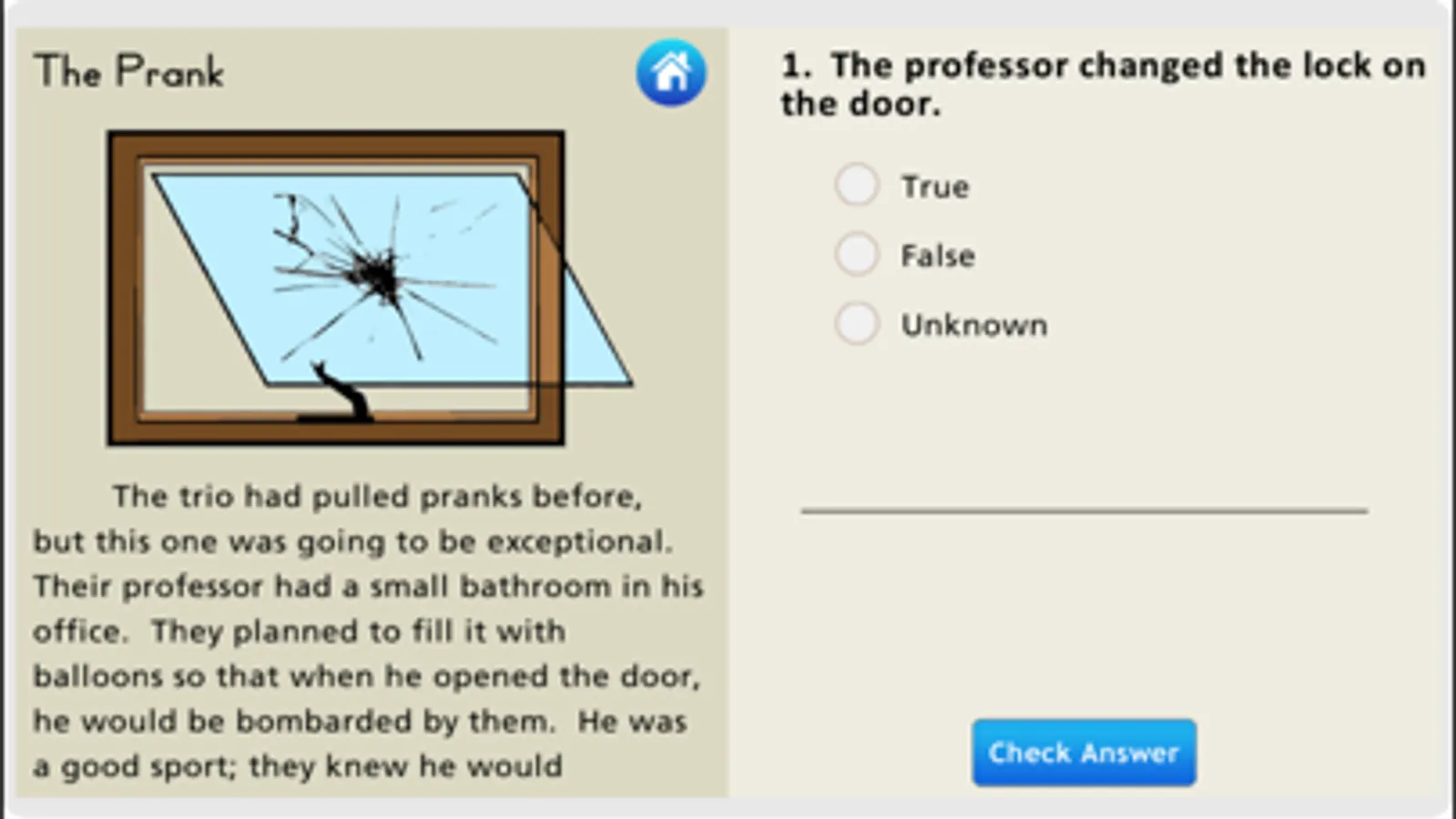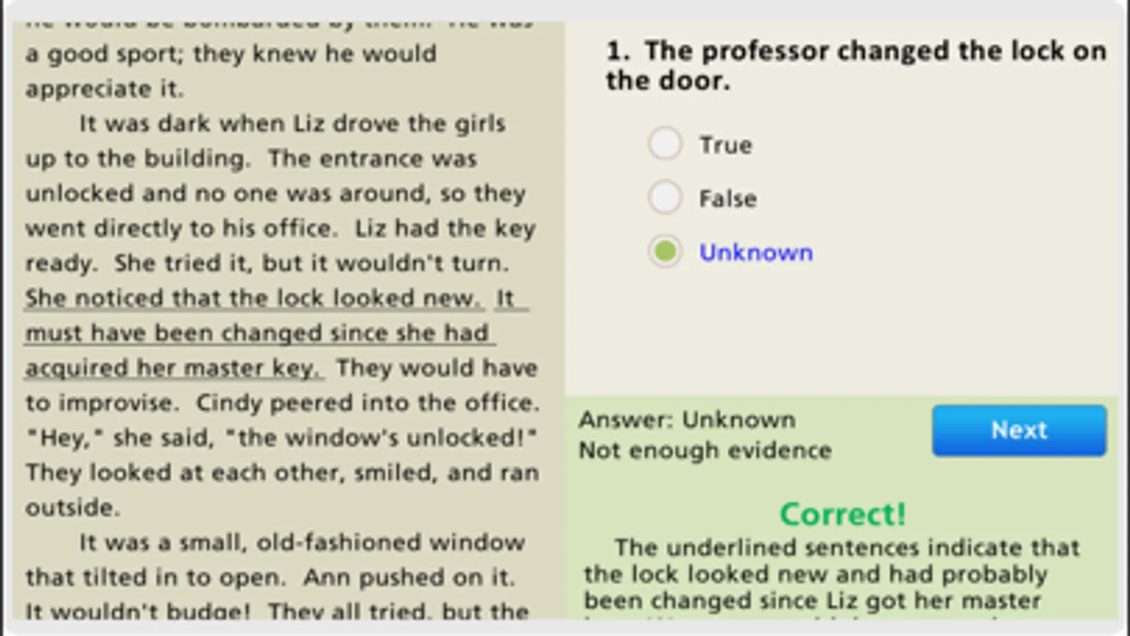 This app provides short, fun, and easy-to-use reading comprehension activities that improve critical reading and higher-order thinking skills. The activities focus on developing the student's ability to draw inferences from written text as they identify and evaluate evidence. Questions following all stories teach students to evaluate details that at first seemed insignificant but are actually meaningful! These activities develop a depth of analysis that guarantees superior inferential and reading comprehension skills for top grades and higher test scores!
