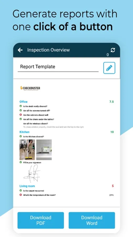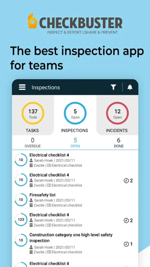 Checkbuster is the leading safety inspection & (ISO) audit app for iPhone & iPad. Based on our worldwide user experience in safety- & quality inspections and incident reports, we’ve created an app to conduct, report and share inspection & audit results within teams.