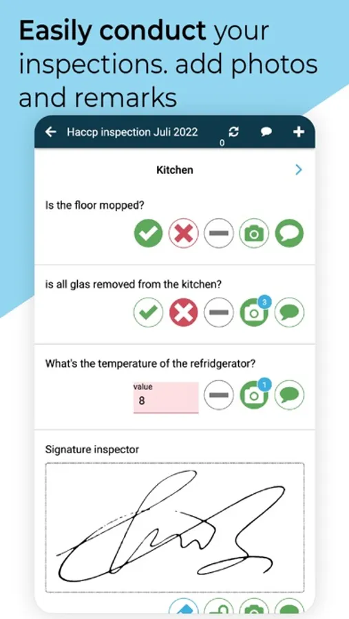 Manage negative inspection results and reports and command the PDCA-circle. From Food Safety/HACCP to ISO 9001, from OSHAS to Fire Safety and construction checklists. Thanks to the complete and secure cloud backup, you and your colleagues can always view reports from any location and give them the desired follow up.