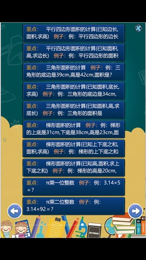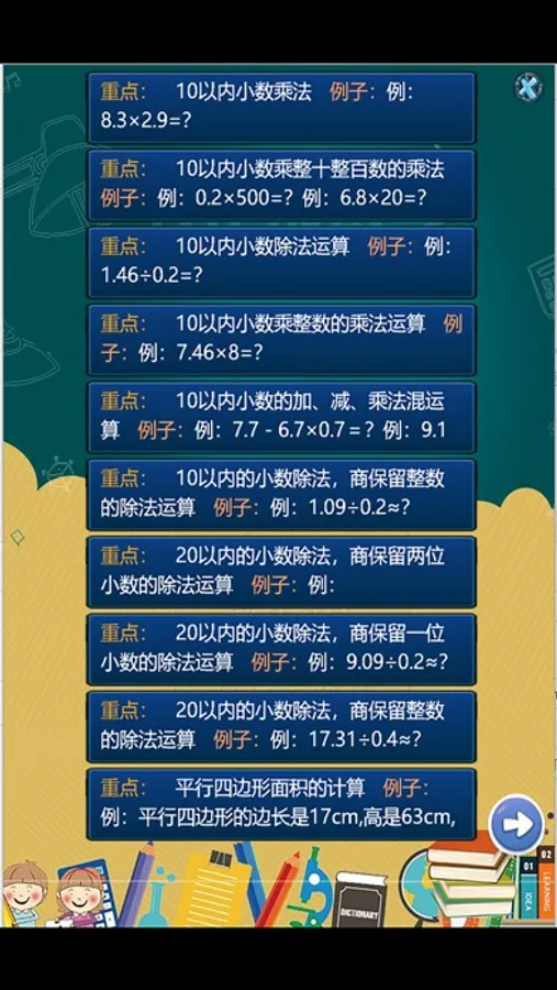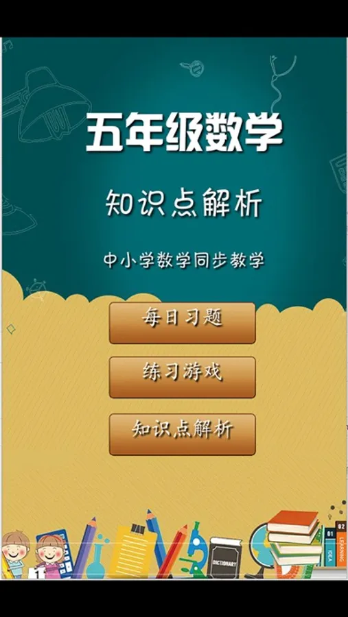 随机出题、每日练题、知识点讲解、单项训练,这个应用适用于小学五年级数学,应用体积小,不过多占用手机或平板空间,不仅收录了所有知识点,还可以对各知识点进行游戏练习,同时还有草稿功能,方便孩子计算。