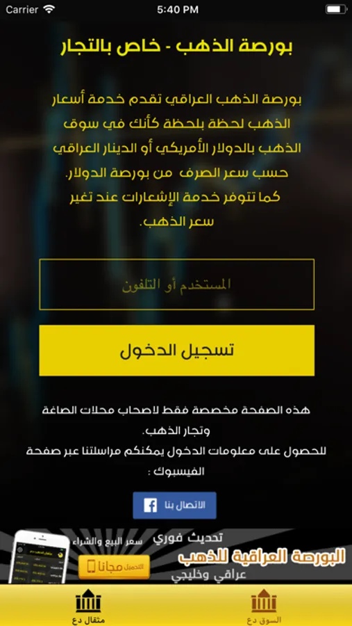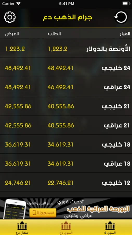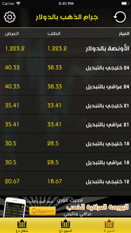 خدمة التجار توفر سعر جرام وأونصة الذهب بالدولار والدينار، بناء على التحديث الفوري لسعر صرف الدولار من بورصة بغداد