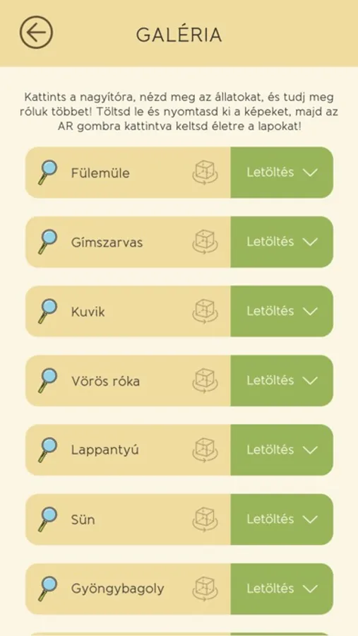 Kattints a nagyítóra, nézd meg az állatokat, és tudj meg róluk többet! Töltsd le és nyomtasd ki a képeket, majd az AR gombra kattintva keltsd életre a lapokat!
