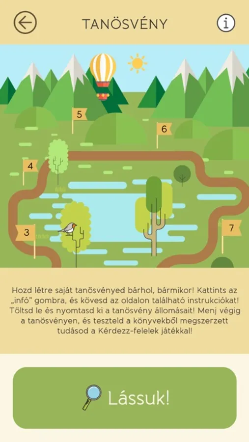 A tanösvény azoknak nyújt segítséget, akik az alkalmazást könyv nélkül szeretnék használni. Menj a https://farkaskolykok.com/app/tanosveny weboldalra, töltsd le a galériából a markeret! A letöltött tartalmakat nyomtasd ki, indítsd el az alkalmazást, menj a Tanösvény menüpontban a „Lássuk!” gombra! Irányítsd a telefonod kameráját a kinyomtatott lapokra, és válaszold meg az összes kérdést, hogy végigmenj a tanösvényen.
