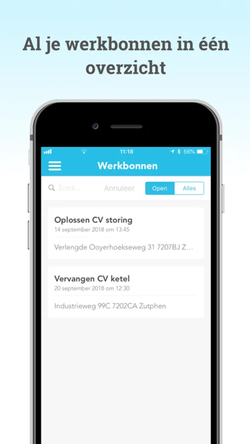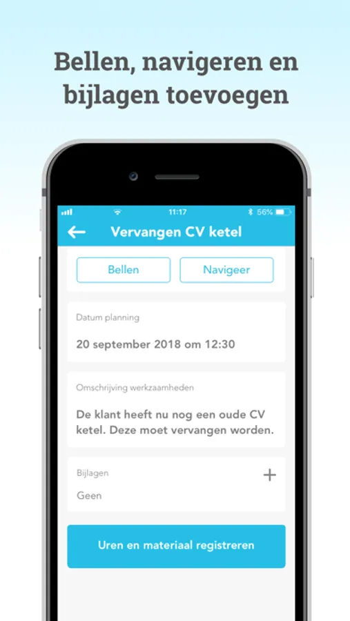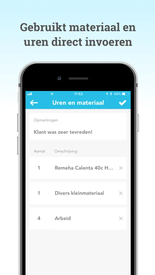 Met de app voor smartphone en tablet kunnen je medewerkers vanuit hun bedrijfsauto werkbonnen raadplegen en vervolgens uren en materiaal opboeken. Geen papieren kladjes met halve informatie.