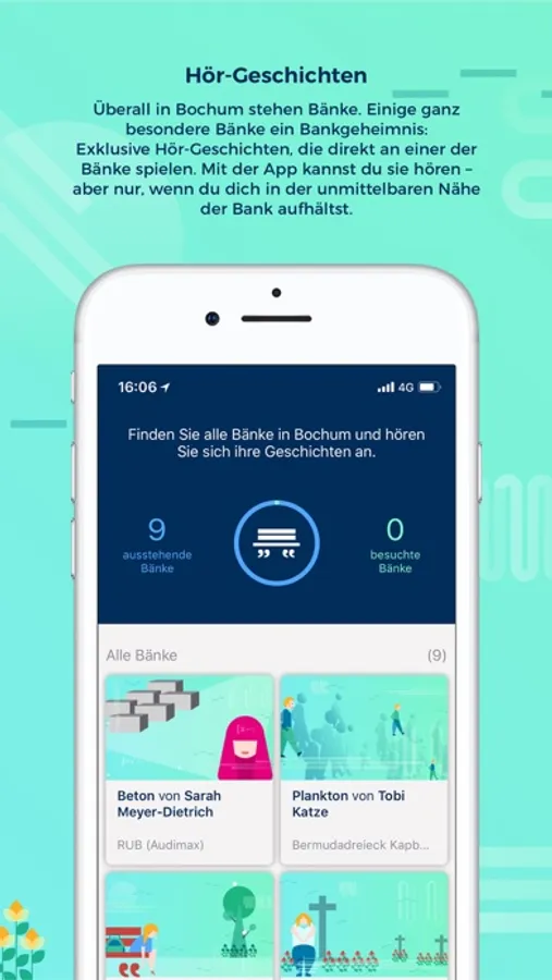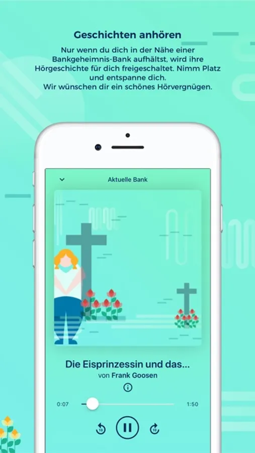 Die App zeigt dir die Position der Bänke an. Vor Ort wird dann die jeweilige Geschichte für dich freigeschaltet und du kannst sie anhören, während du auf der Bank platz nimmst – genau an dem Ort, an dem die Geschichte spielt. Wir wünschen dir ein schönes Hörvergnügen.