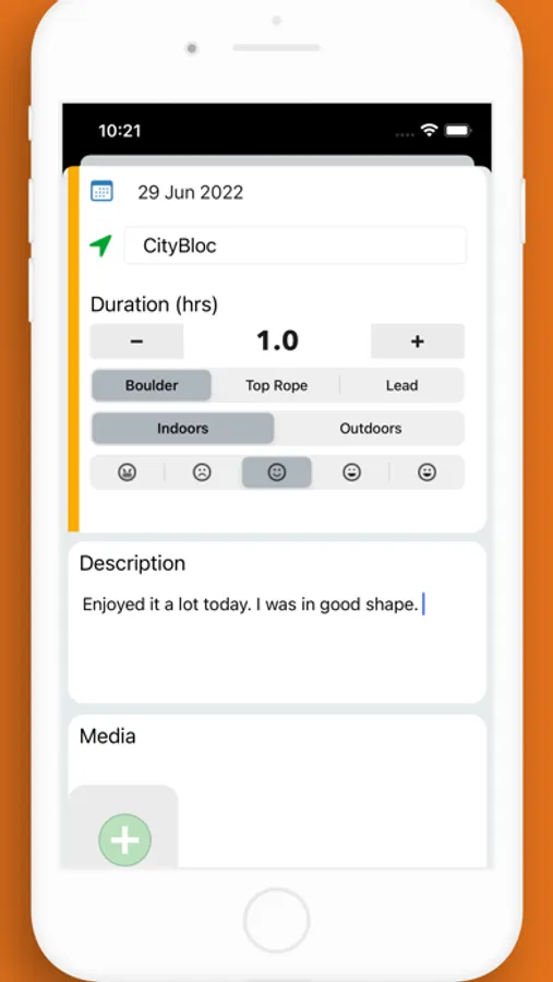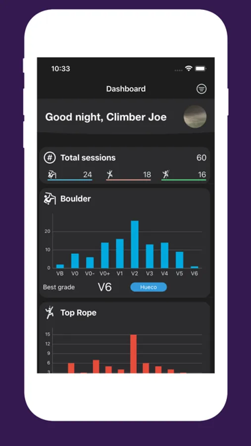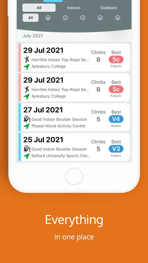 This is the only app that allows you to effortlessly add and track all your climbing sessions (during or after the session) including specific details such as the climbing style, date and duration of the session, location and session “mood”.