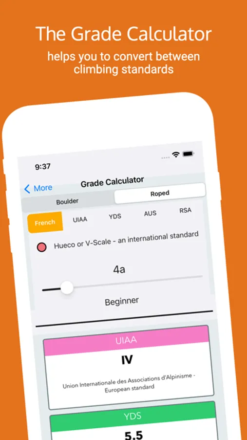 We have built the app so that it supports all these grading standards : ‘Hueco’, ‘French’, ‘British Technical’, ‘Yosemite Decimal System’, ‘UIAA’, 'Australia', 'RSA' or ‘Font’