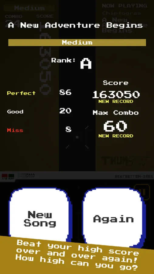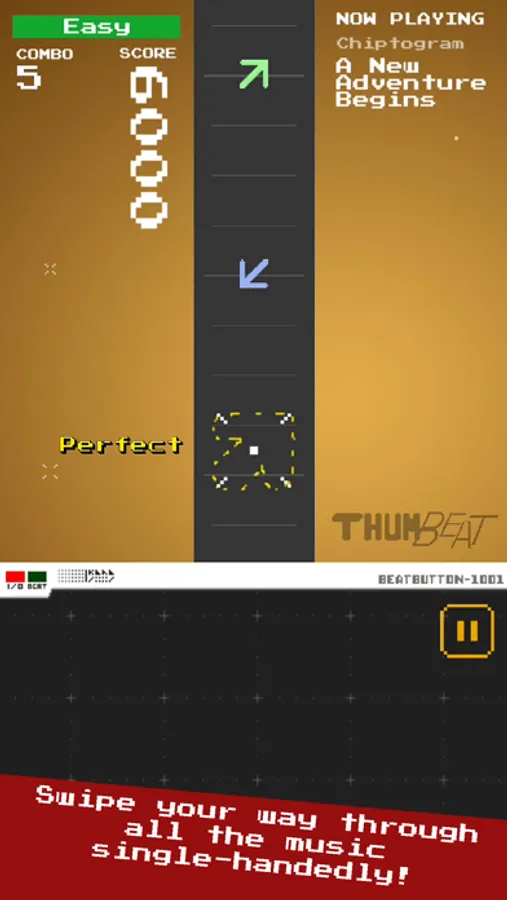 ThumBeat is a one-thumb rhythm game for busy people! Designed to be played when in crowded spaces (like standing up in trains, on buses) or multitaskers (jog and play? I want to see someone try!).