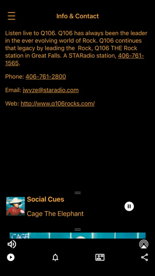 Listen live to Q106. Q106 has always been the leader in the ever evolving world of Rock. Q106 continues that legacy by leading the Rock, Q106 THE Rock station in Great Falls. A STARadio station, 406-761-1565.