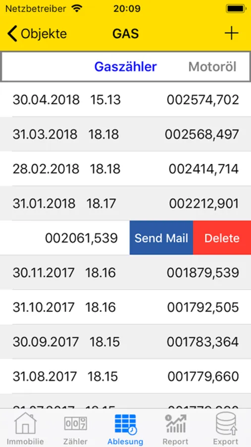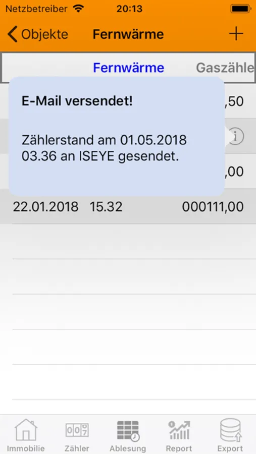 - E-Mail Versand des Zählerstandes an ihrem Provider oder individueller Mailadresse mit nur einem Klick (diese Meldung wird in der Liste markiert)