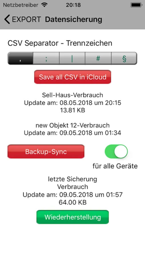 Die vordefinierten Zähler sind farblich hinterlegt, um eine schnelle Unterscheidung zu bieten. Eine CSV-Erstellung wird in iCloudDrive gespeichert und kann von jedem Gerät verarbeitet werden. Zudem bietet die APP eine Datensicherung für das benutzte Gerät separat und/oder für alle Geräte. D.h. Sie können entscheiden ob alle Ihre Geräte (iPhone oder iPad) unterschiedliche Immobilien erfassen oder die Daten gleich gehalten werden sollen.