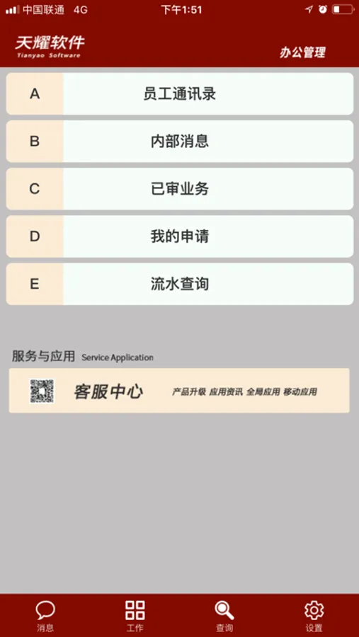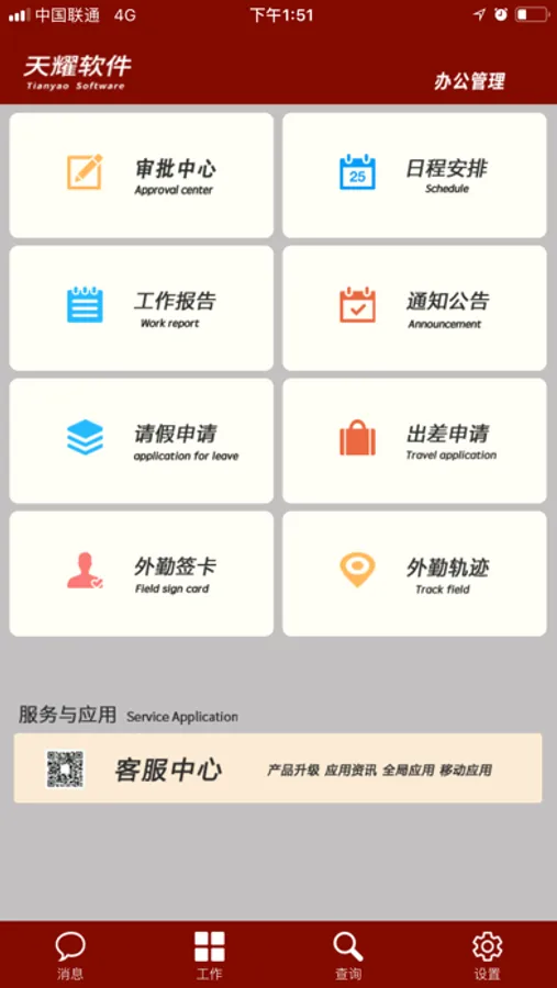 天耀云OA是速达软件技术(广州)有限公司出品的一款可以同时在ERP、进销存、速达财务使用的一款APP。它把OA功能独立出来,即简化了操作流程,又分隔了不同人的功能。包含工作、消息、查询等模块;审批中心、日程安排、通知公告、外勤签卡等功能。