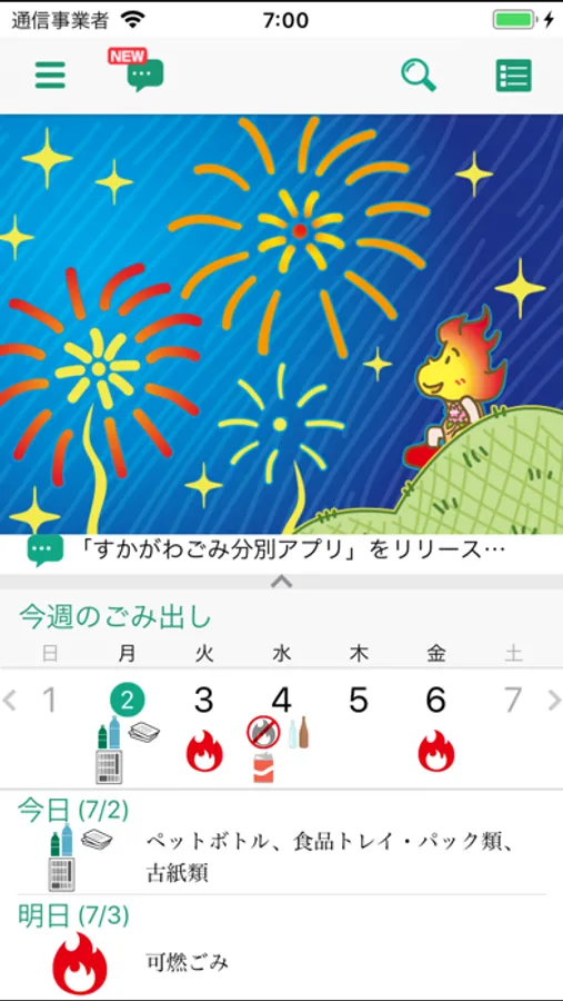 須賀川でのごみの収集日やごみの出し方、出す時の注意点、ごみ分別辞典、よくある質問など、ごみに関する様々な情報を身近なスマートフォンを利用して簡単に確認できるアプリケーションをリリースしました。