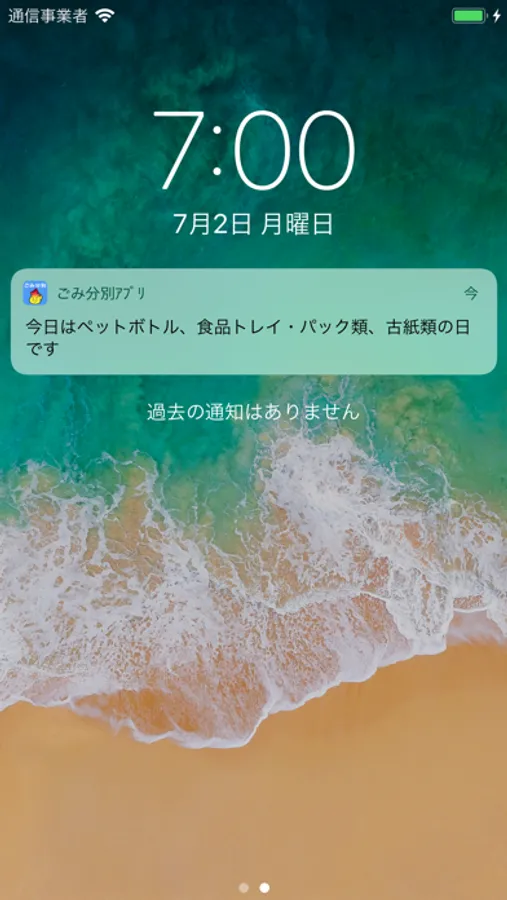 収集予定のごみ種別を前日と当日にアラートでお知らせします。時間は自由に設定することができます。