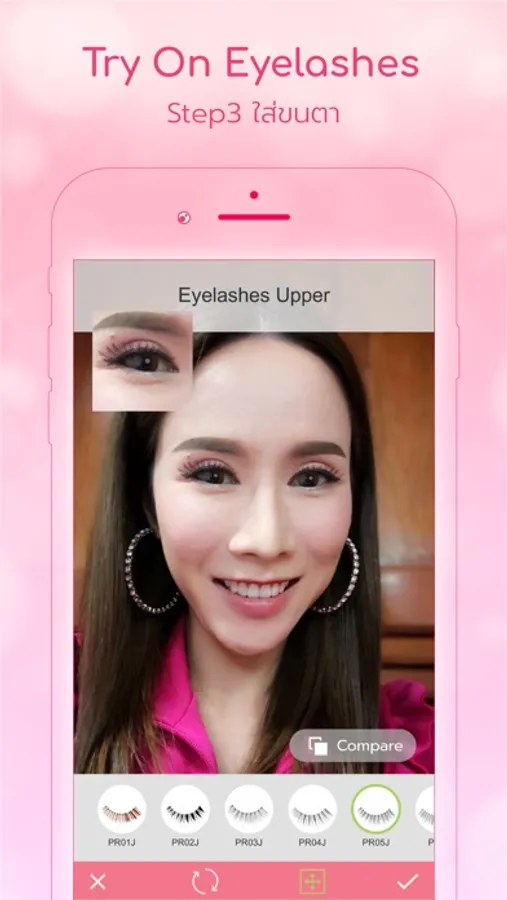 เลือกเมนูขนตาปลอม เลือกว่าจะใส่ขนตาบนหรือล่าง และเลือกแบบขนตาที่คุณต้องการ