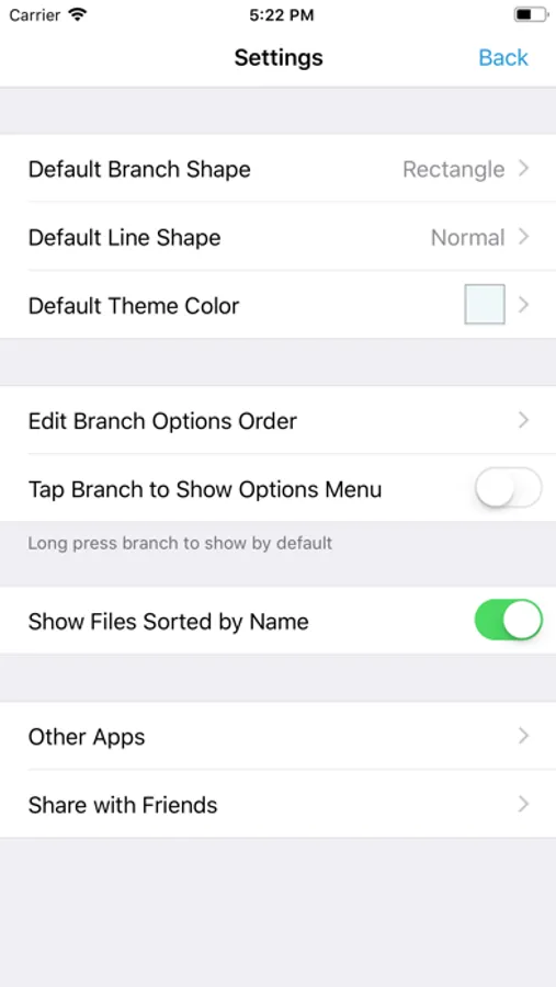 Click the branch to begin editing, and long press to show menu options that you can move, copy, delete, connect, export for branches. You can change the shape of branches, the theme of diagram in the App Settings.