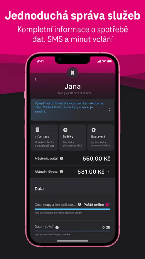 - You can see information about your current spending, how many free minutes, SMS and data you have left. Top-up data is easy in our app.
