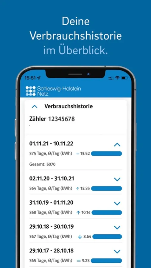 In Ihrer Verbrauchshistorie finden Sie alle Ihre Verbräuche, bis auf die freiwilligen Ablesungen (Zwischenablesungen), grafisch und tabellarisch aufgelistet.
