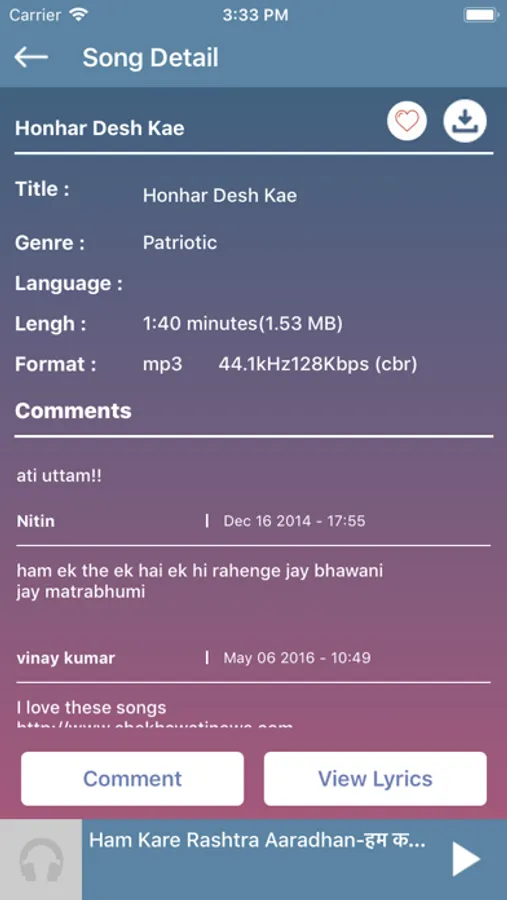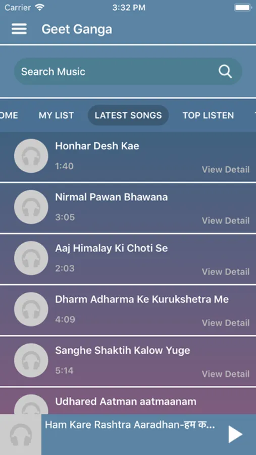 Geet Ganga is one stop resource for 100s of free patriotic and inspirational MP3 songs in over 14 Indian languages. Enjoy MP3 geet in Bengali English Hindi Kannada Malayalam Marathi Marwari Oriya Sanskrit Tamil Telugu and many more you can download song and play it offline, Create your Favorite songs playlist and play it any time.