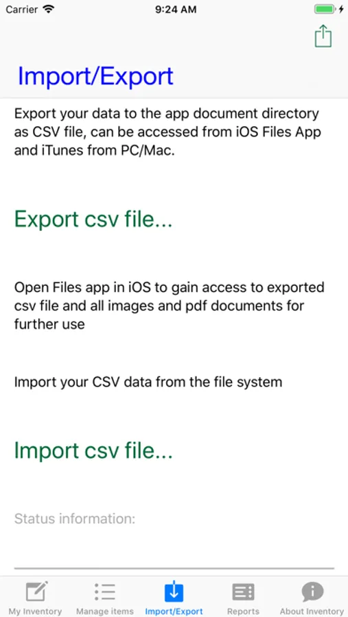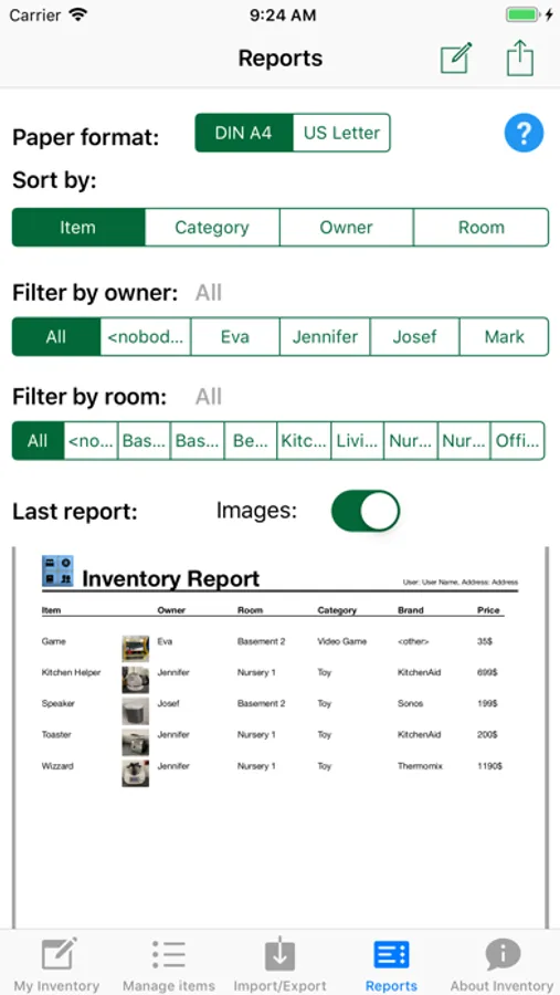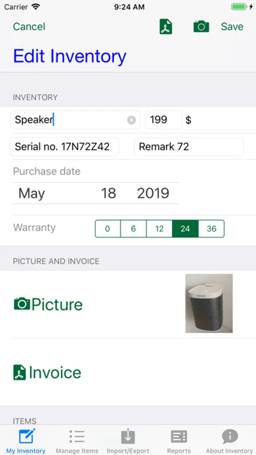 With the the app come several sample categories, brands, owners and rooms. With first use it is recommended to change that under „Manage items“. Afterwards the user can start gathering inventory items. There can be photos (user must allow camera use) and PDF files with invoice data included as well.