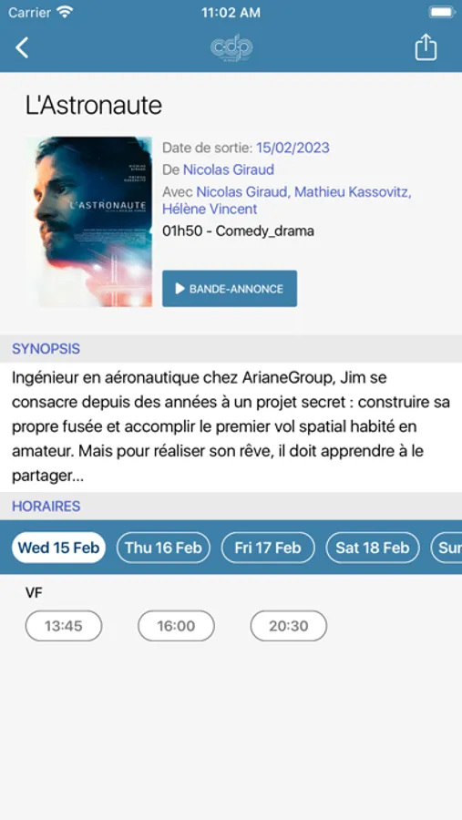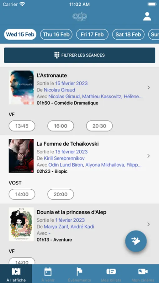 - Les séances disponibles dans l'heure, avants premières et événements spéciaux