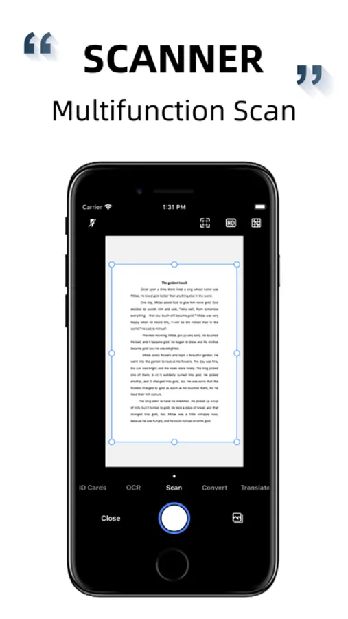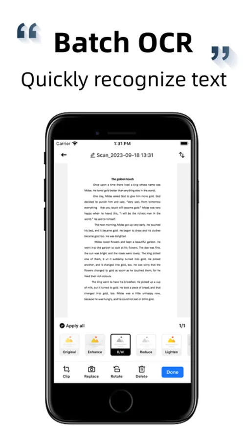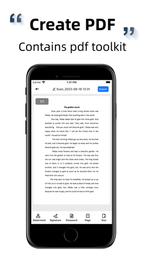 Fast scan documents, automatic edge recognition, automatic clipping, perspective correction, provide a variety of filters for you to choose, one button generation of PDF format, support to add/remove watermark, adjust page number, size, set PDF open password, etc.