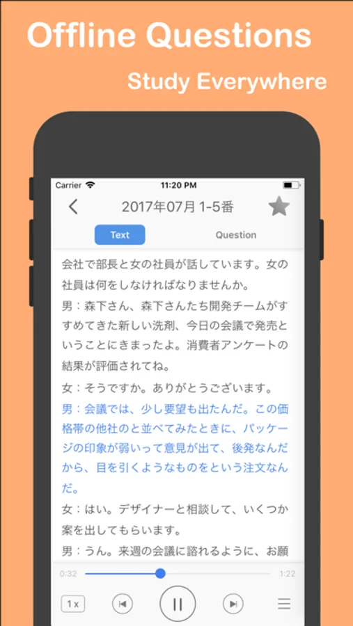 本アプリは日本語能力試験における聴解問題の成績を短期間で向上させるために開発されましたが、主に以下の機能を提供します。