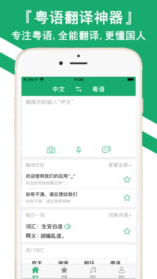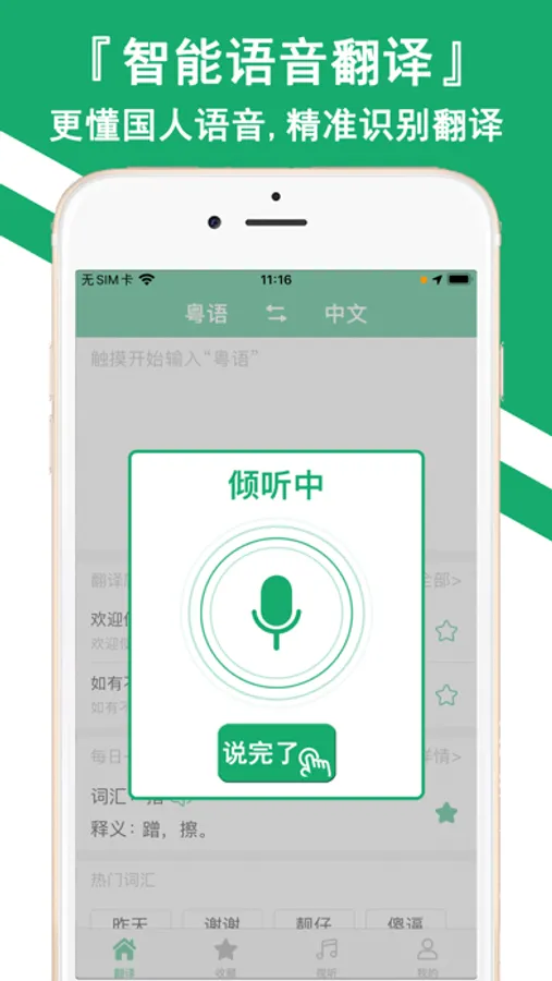 语音翻译:语音识别中文/粤语,高效率输入,随身粤语翻译器。