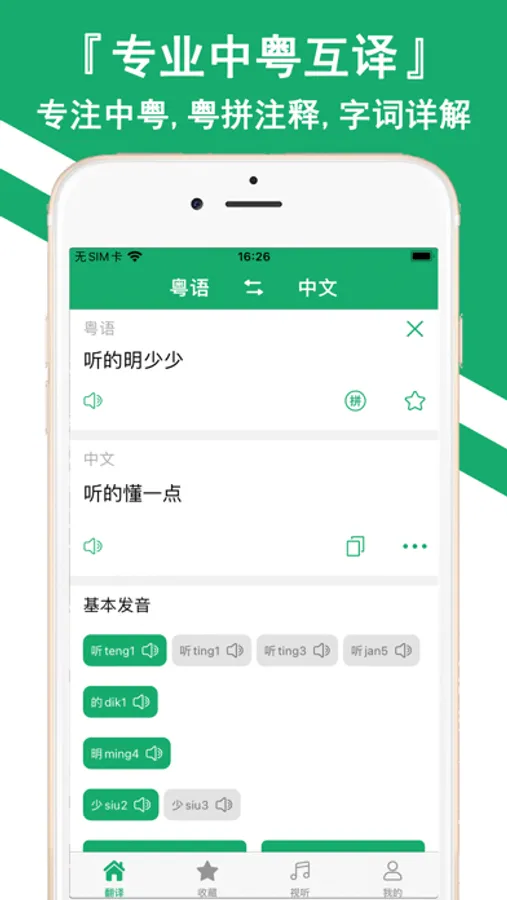 【粤语翻译神器】一款学广东话必备的粤语翻译软件,专业中粤互译,还有粤语发音词典,同时精选,粤语基础教学视频教程、粤语有声教学、粤语故事和相声评书等。