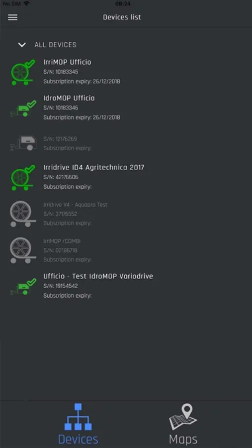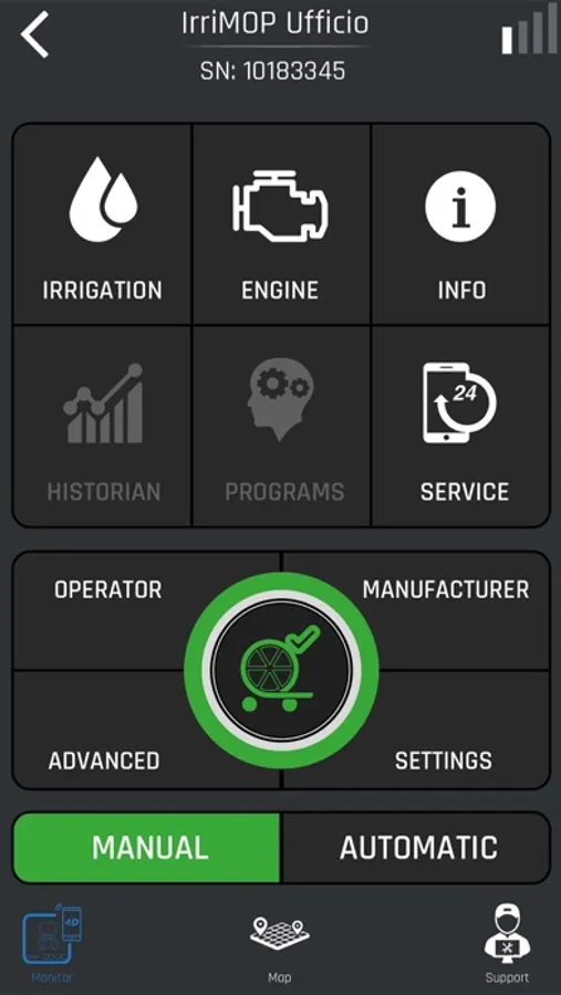 The devices are permanently connected to the Internet and display in real time the current status of the corresponding device (irrigation machine or pump system) and their local position.