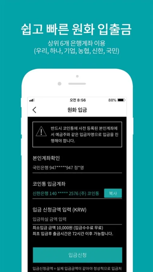 - 특정 은행의 계좌가 필요했던 기존 거래소 방식과 달리 상위 6개 은행계좌만 있다면 누구나 이용 가능