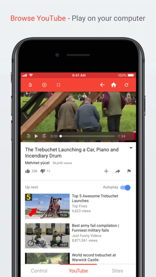 You get all the controls you expect; Play Pause, Seeking, Volume, Fullscreen, plus you can browse on your iDevice.