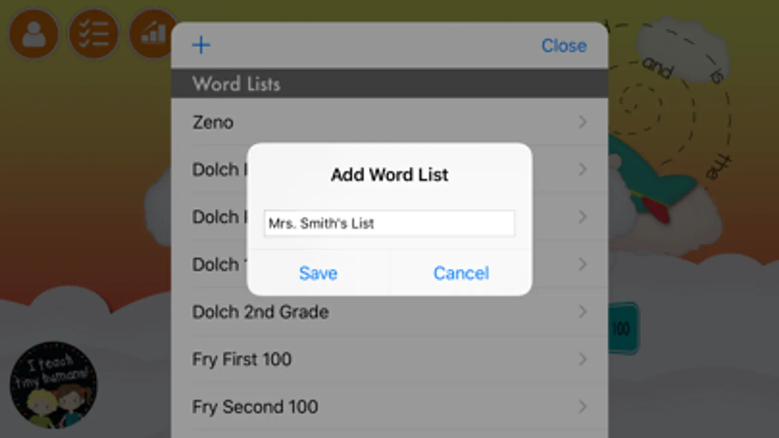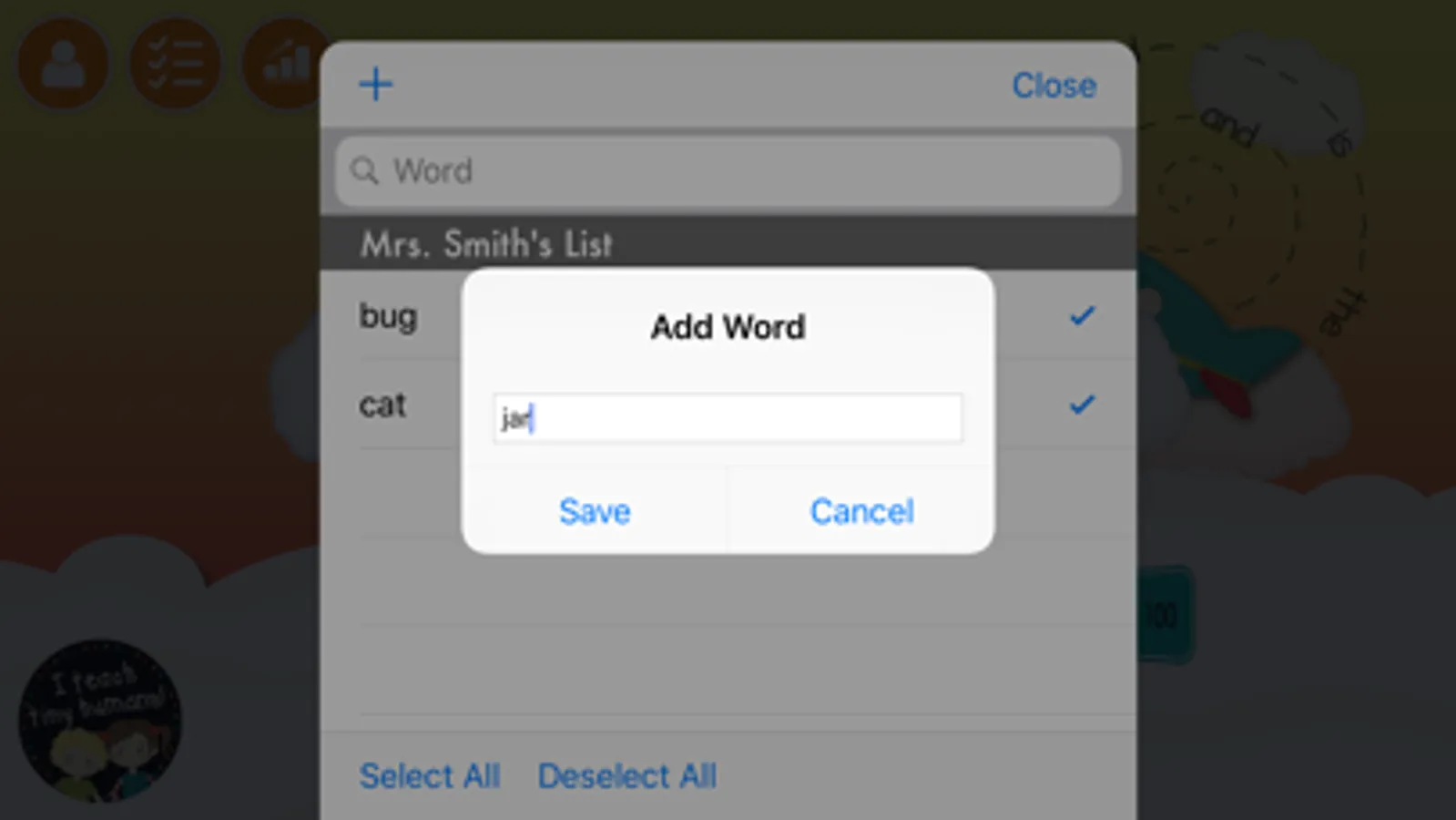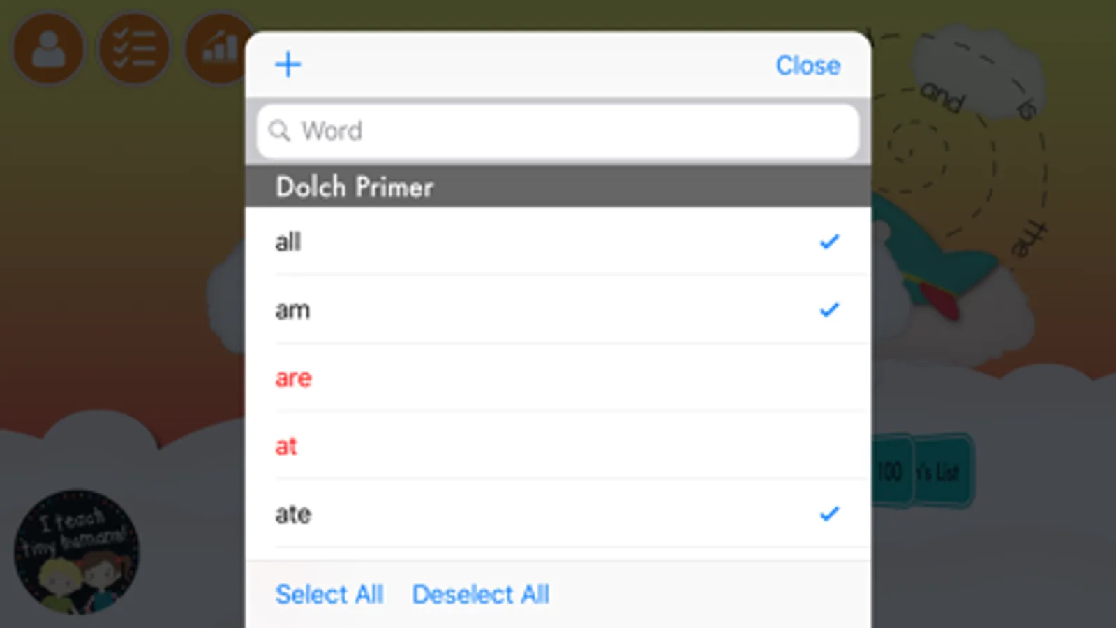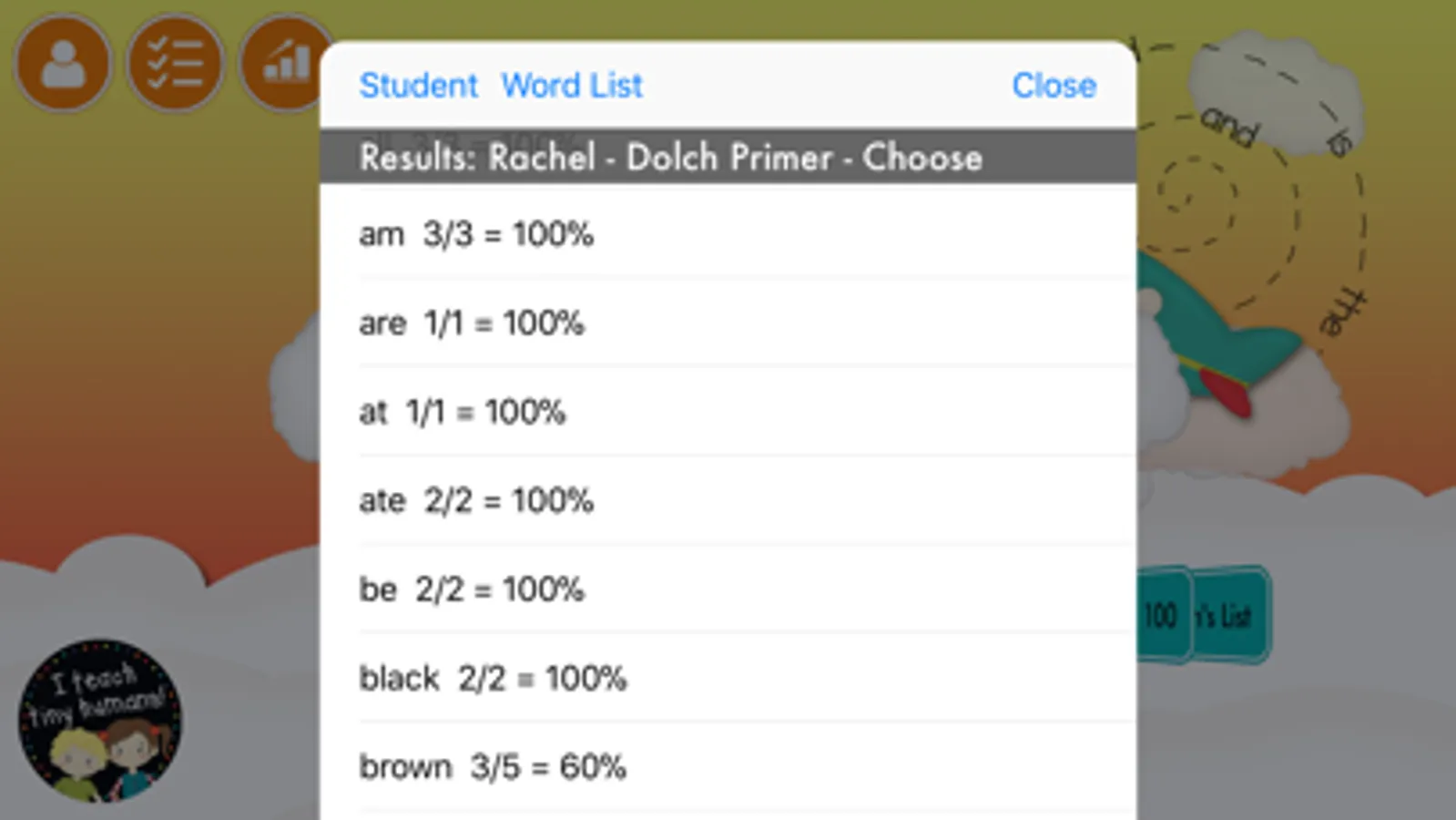 Unlimited students can be added to the game and every interaction is recorded for each student. This allows educators and parents to monitor progress and focus on specific words. Words in each list can be selected to allow for practice where it is most needed.