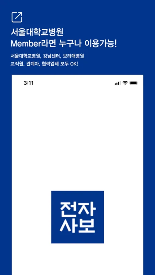 전자사보 앱은 서울대학교병원, 보라매병원, 강남헬스케어센터 그리고 함께하는 모든 협력사 직원을 대상으로 서비스하는 공식 앱입니다.