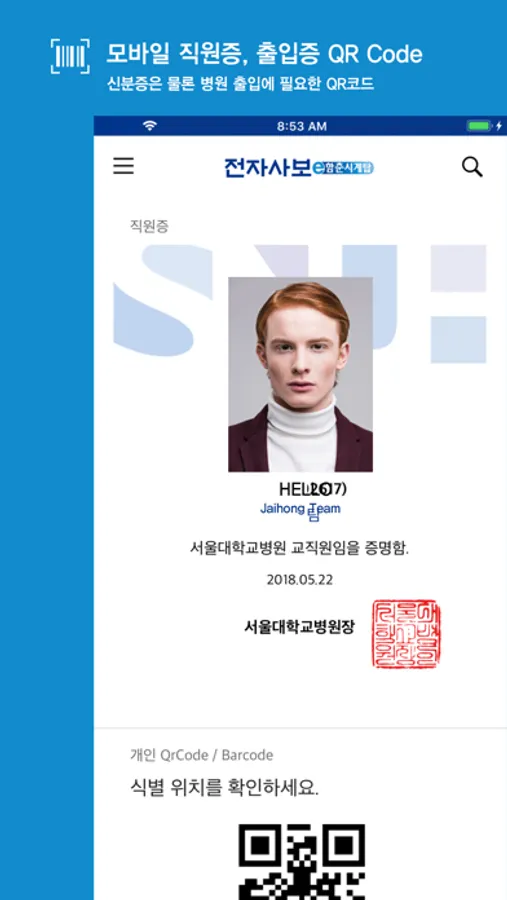 본 앱이 제공하는 모바일 직원증은 할인 혜택, 제중원 서재 회원 등록, 병동 출입 시 신분증으로 사용하실 수 있습니다.