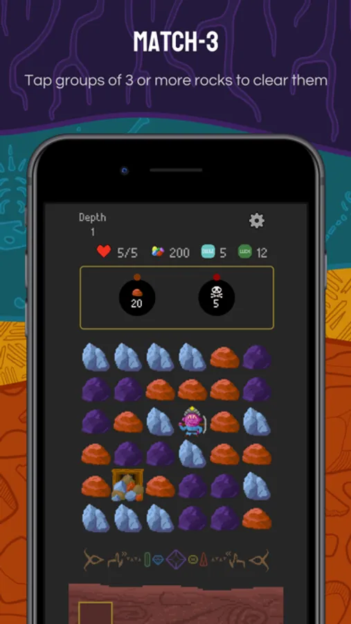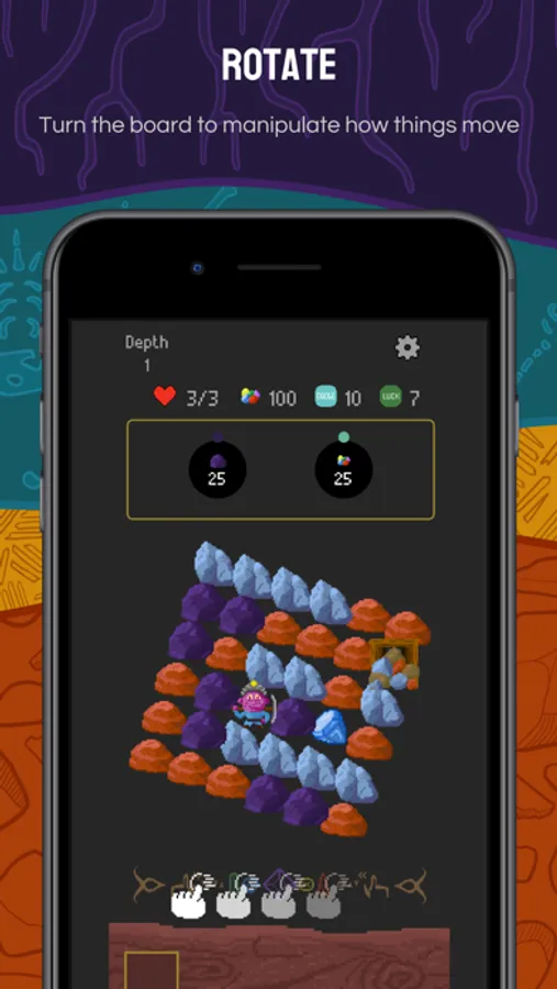 Manipulate your player and the board by rotating it and clearing groups of 3 or more rocks.