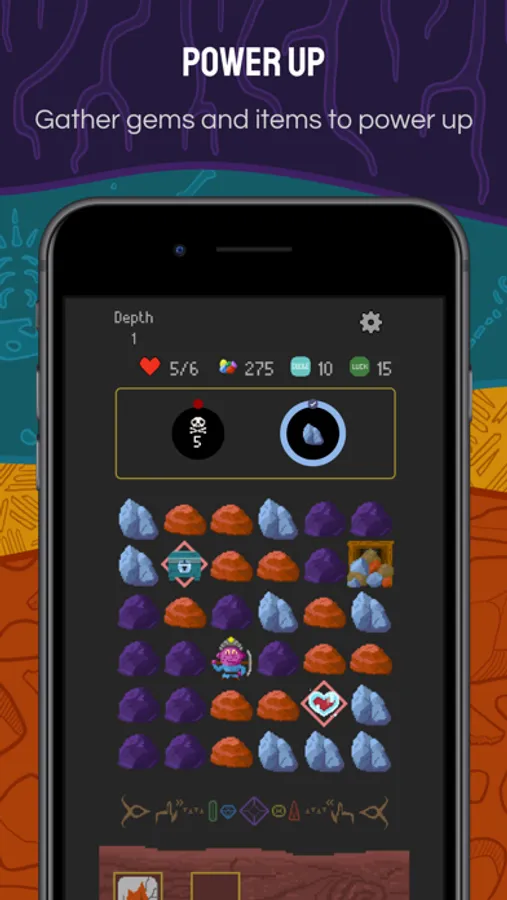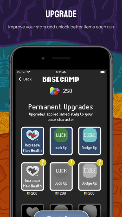 Collect and spend gems to upgrade your stats and unlock over 30 different items during each run.