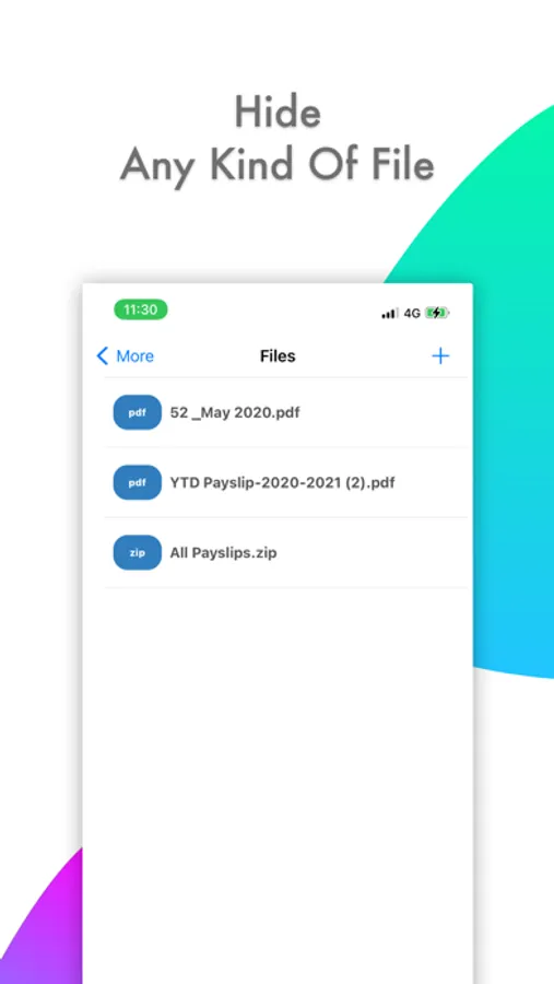This app let's you hide all kind of you file including Photos. Videos, PDF, Word Document, Excel Sheets, Numbers, Pages, Text files, Zip Archives.