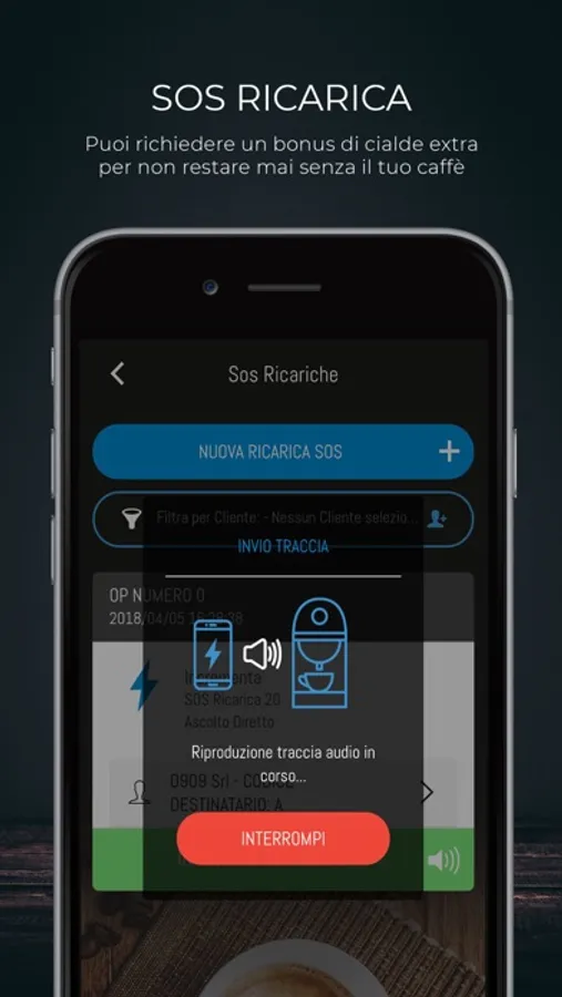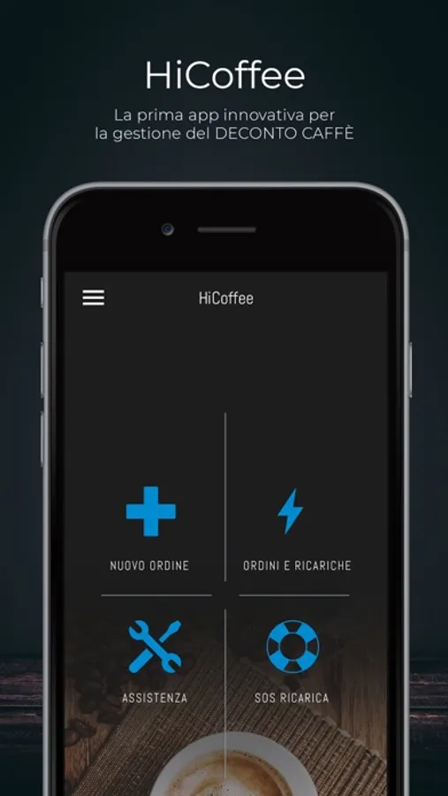L'app HiCoffee, semplice e intuitiva, permette l'invio di ordini e relativo monitoraggio, richiesta manutenzioni, consultazione cataloghi e listini, richiesta sos ricarica (bonus di ricariche extra per non restare con la macchina bloccata) e la facilità della gestione del deconto.