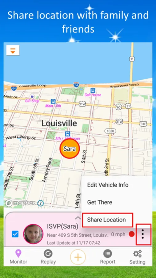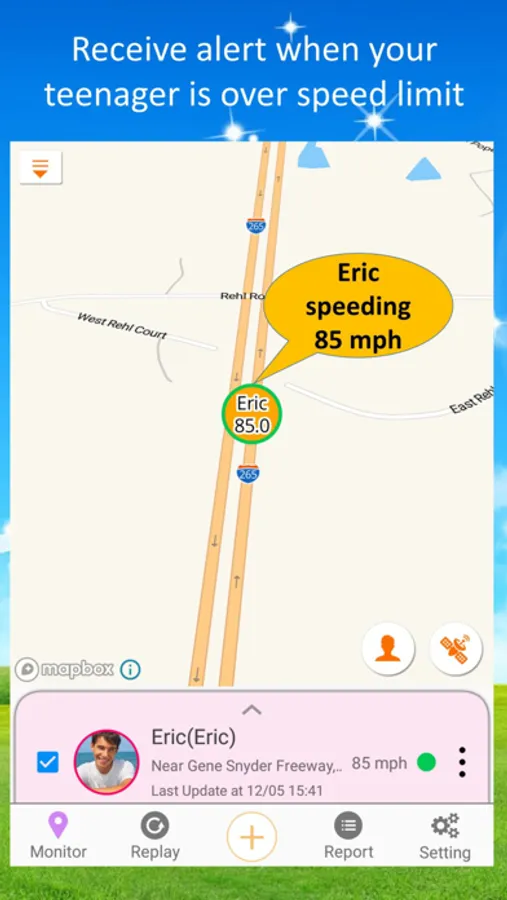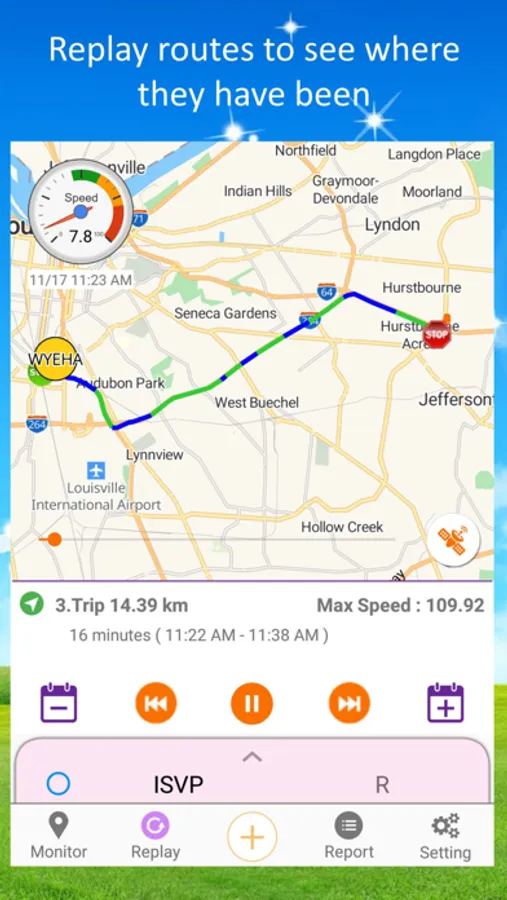 - Replay: when and where your vehicle/child went since you installed the app. It also shows the stops made by your vehicle, locations of speeding, dangerous driving behavior, engine idle, and more.