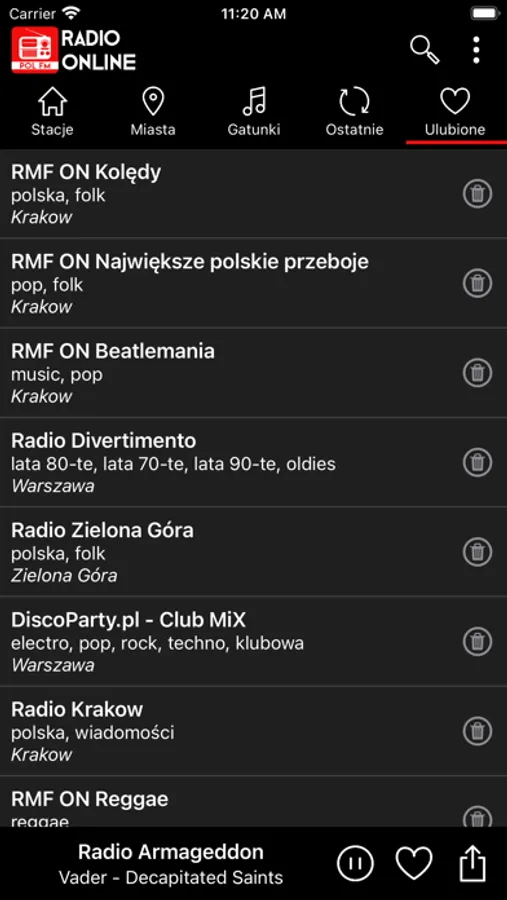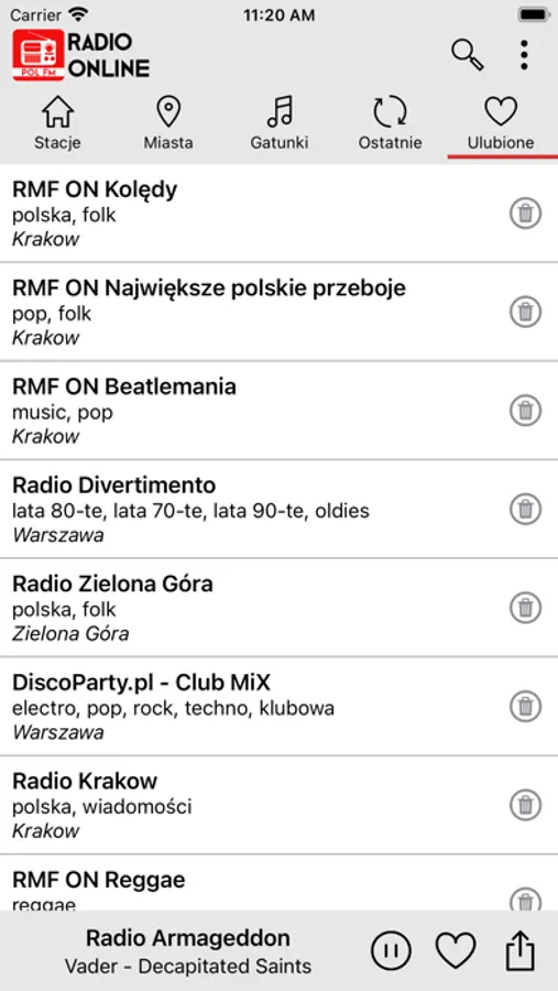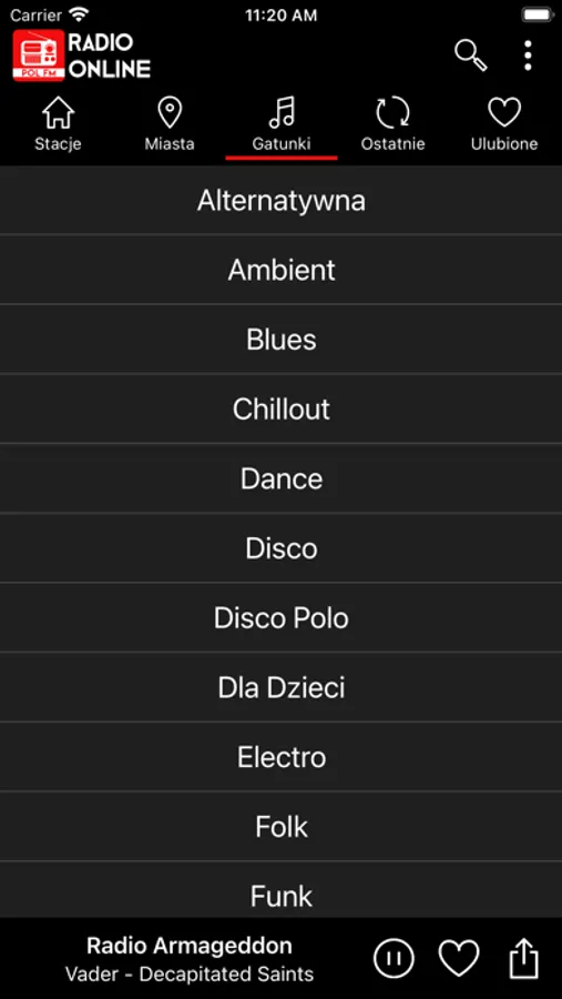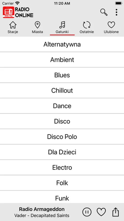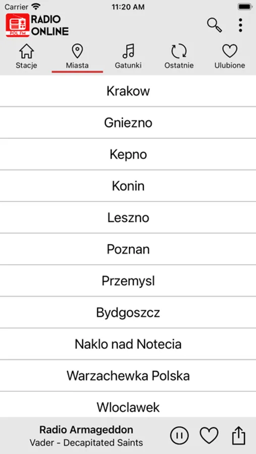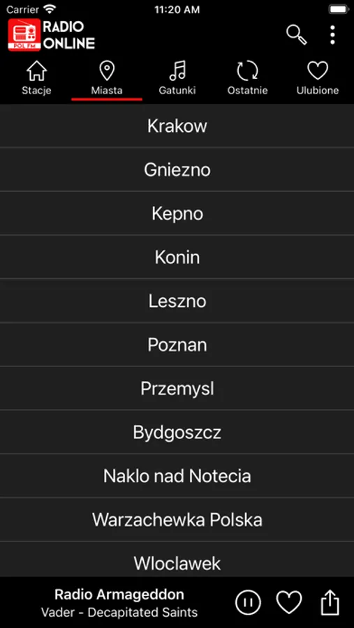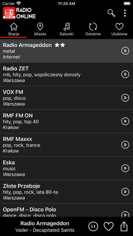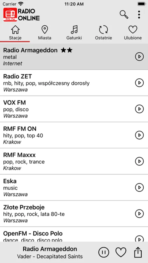 Możesz przeszukiwać na telefonie listę popularnych polskich stacji radiowych, korzystając z takich kryteriów, jak gatunki czy miasta. Lista stacji radiowych jest sortowana według popularności stacji w aplikacji. Po wybraniu ulubionej stacji radiowej i naciśnięciu przycisku aplikacja będzie działać w tle, podczas gdy Ty gdy będziesz korzystać z telefonu.
